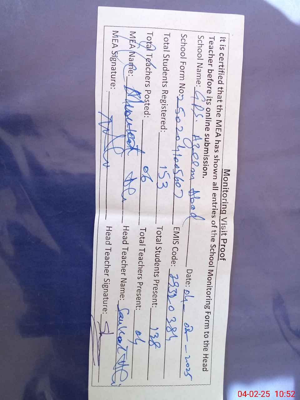 | EMIS Code: 39320384 | Name of School: GPS AZEEM ABAD , OKARA | |||