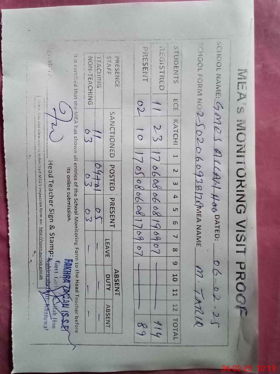 | Attendance Register | Head Teacher | MEA with School | Visit Proof |