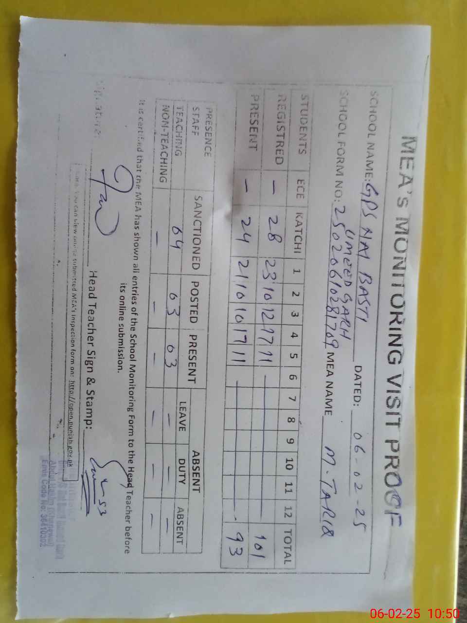 | Attendance Register | Head Teacher | MEA with School | Visit Proof |