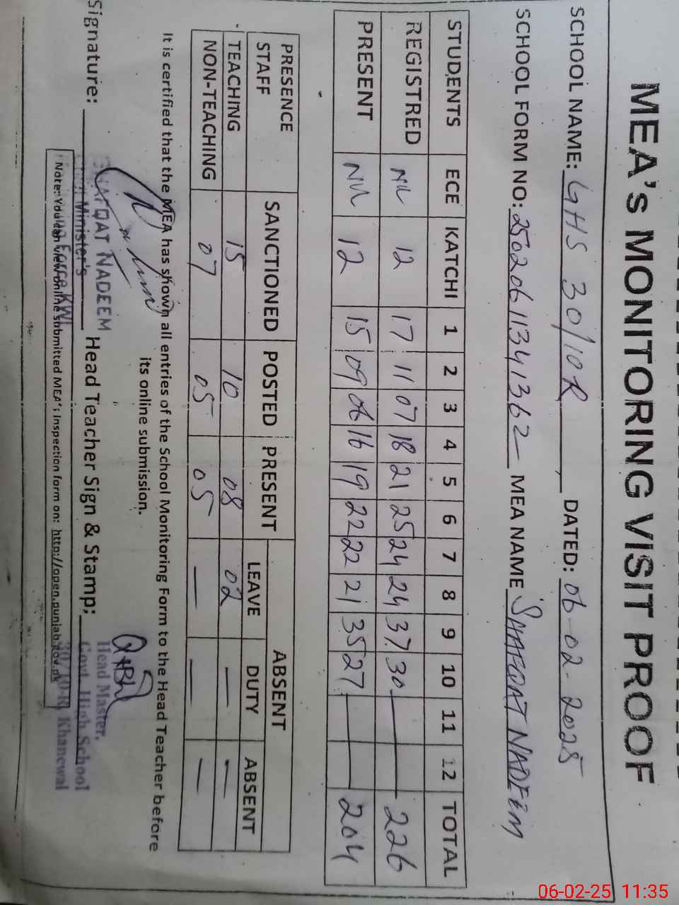 | Certified that this School was Inspected by the Undersigned MEA/DMO Today and the Information Stated Above is as Per Record. | |||||