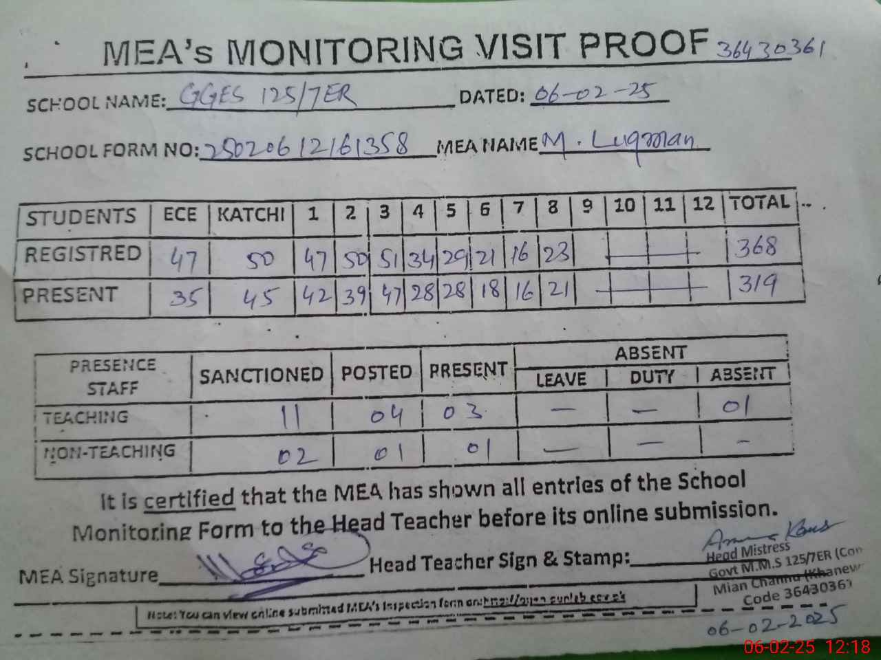 | Attendance Register | Head Teacher | MEA with School | Visit Proof |