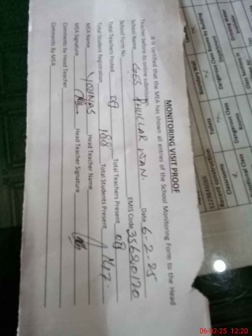 | Attendance Register | Head Teacher | MEA with School | Visit Proof |