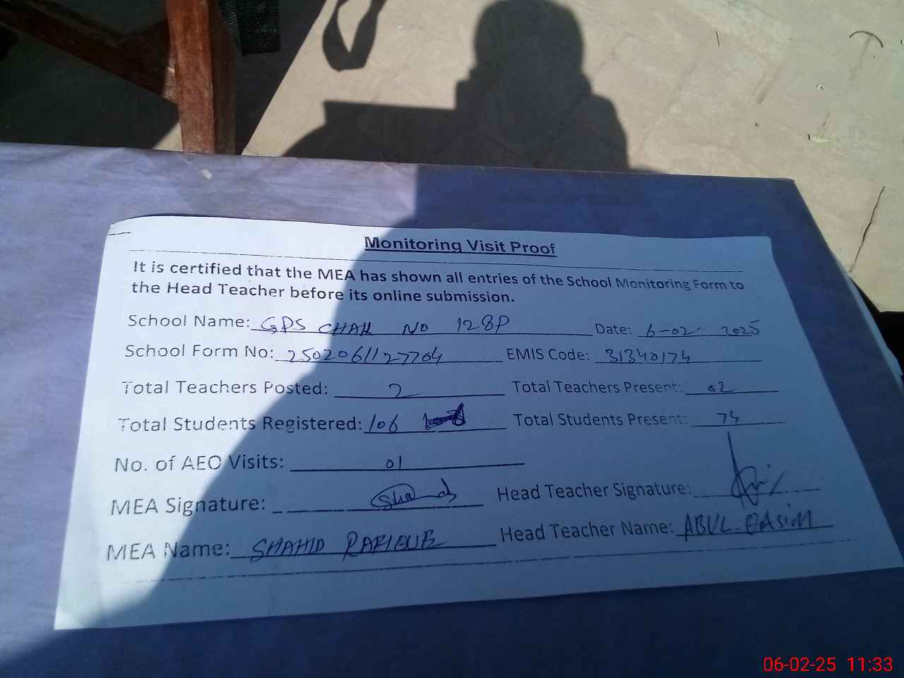 | Attendance Register | Head Teacher | MEA with School | Visit Proof |