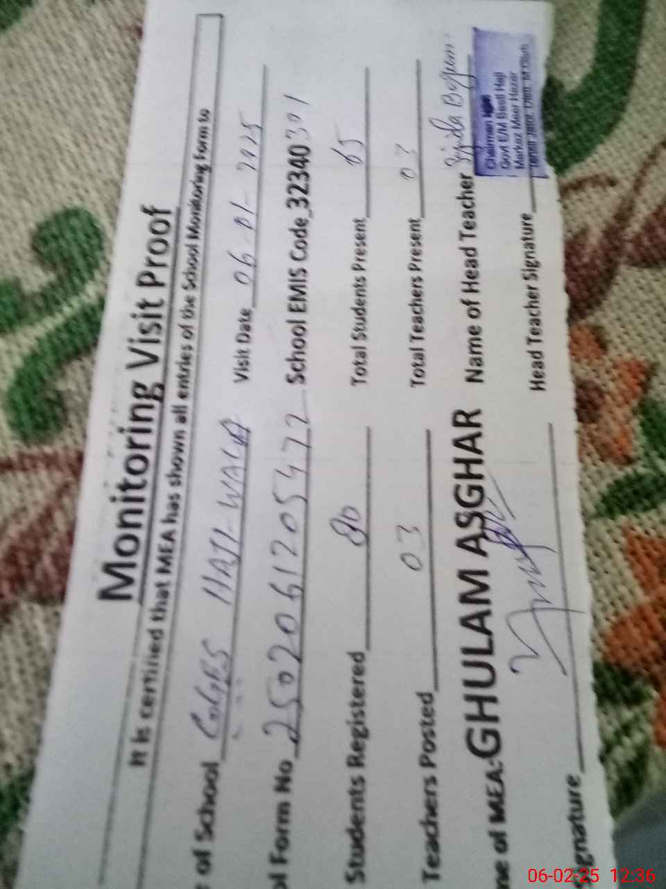 | Attendance Register | Head Teacher | MEA with School | Visit Proof |