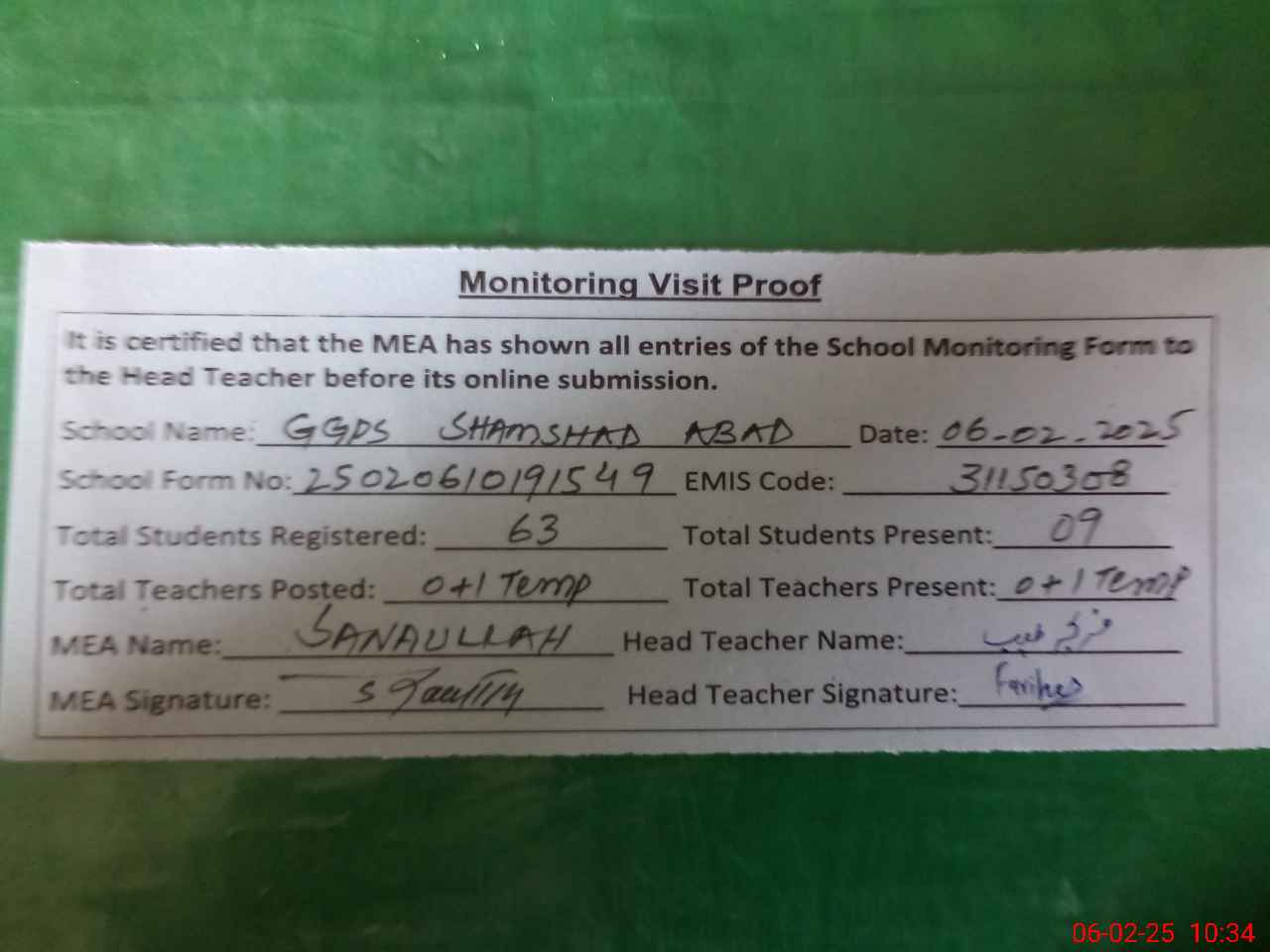 | EMIS Code: 31150308 | Name of School: GGPS SHAMSHAD ABAD | |||