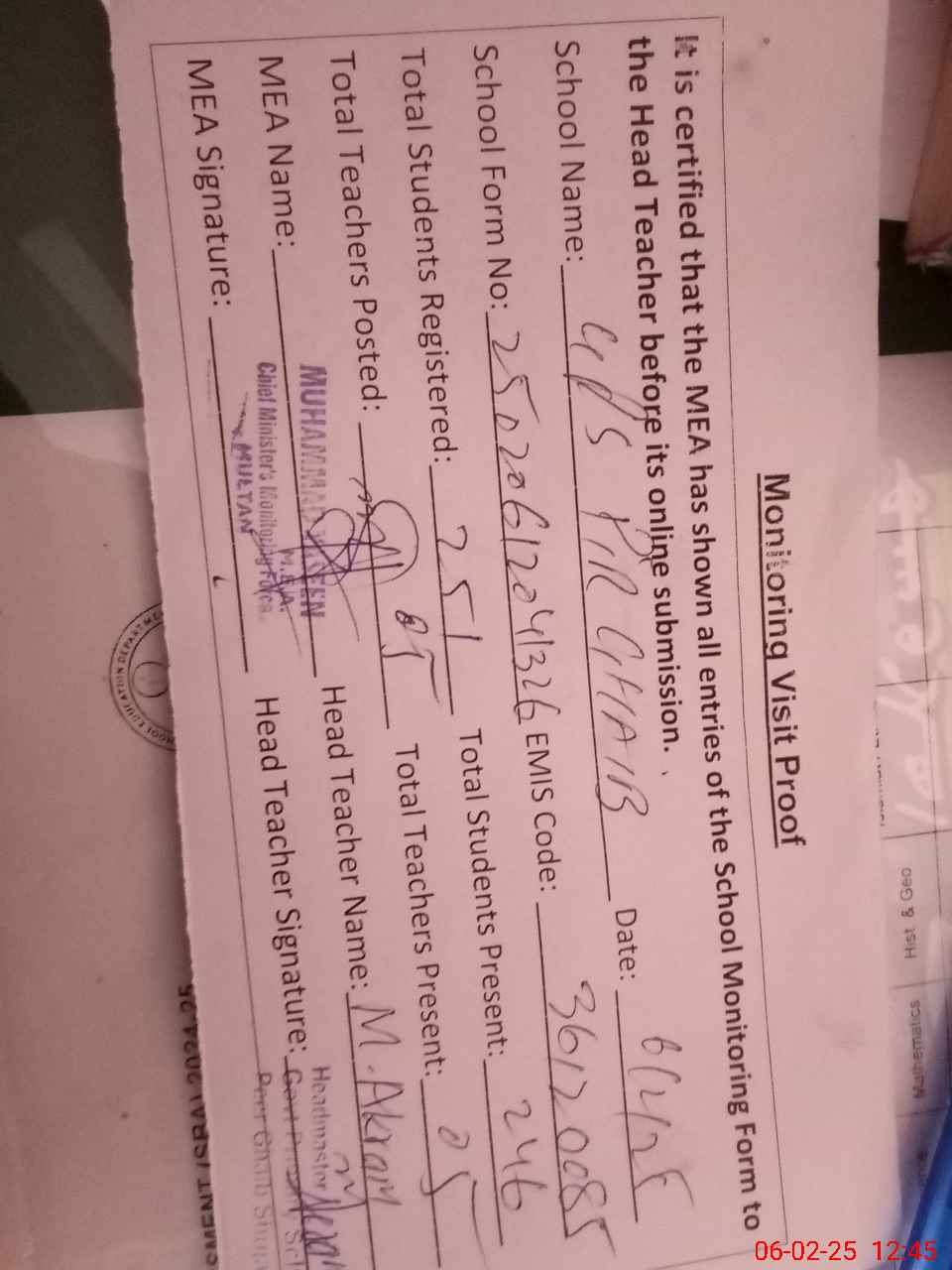 | Attendance Register | Head Teacher | MEA with School | Visit Proof |