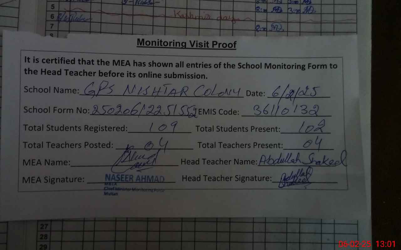 | EMIS Code: 36110132 | Name of School: GPS NISHTAR COLONY MULTAN | |||