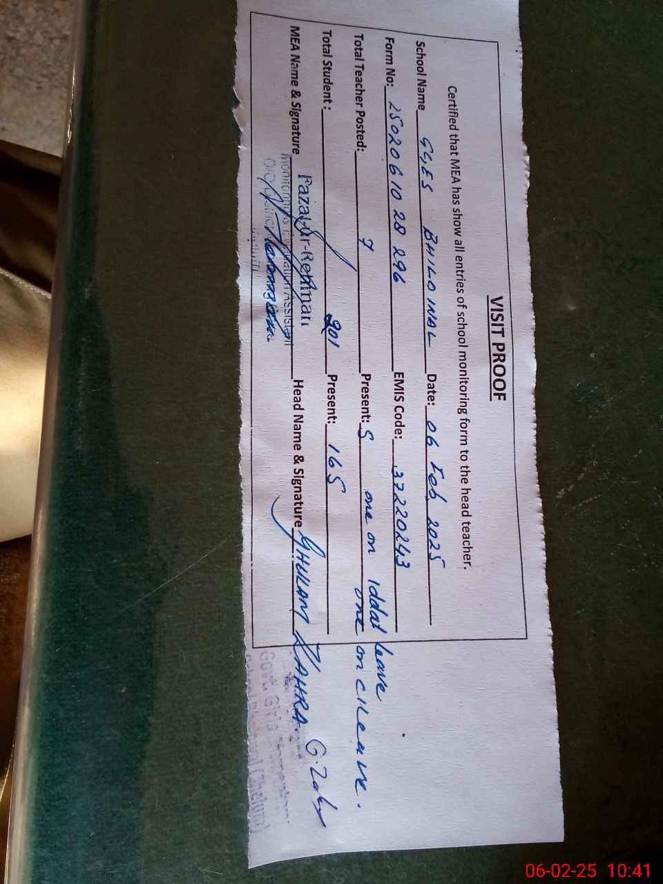 | Attendance Register | Head Teacher | MEA with School | Visit Proof |