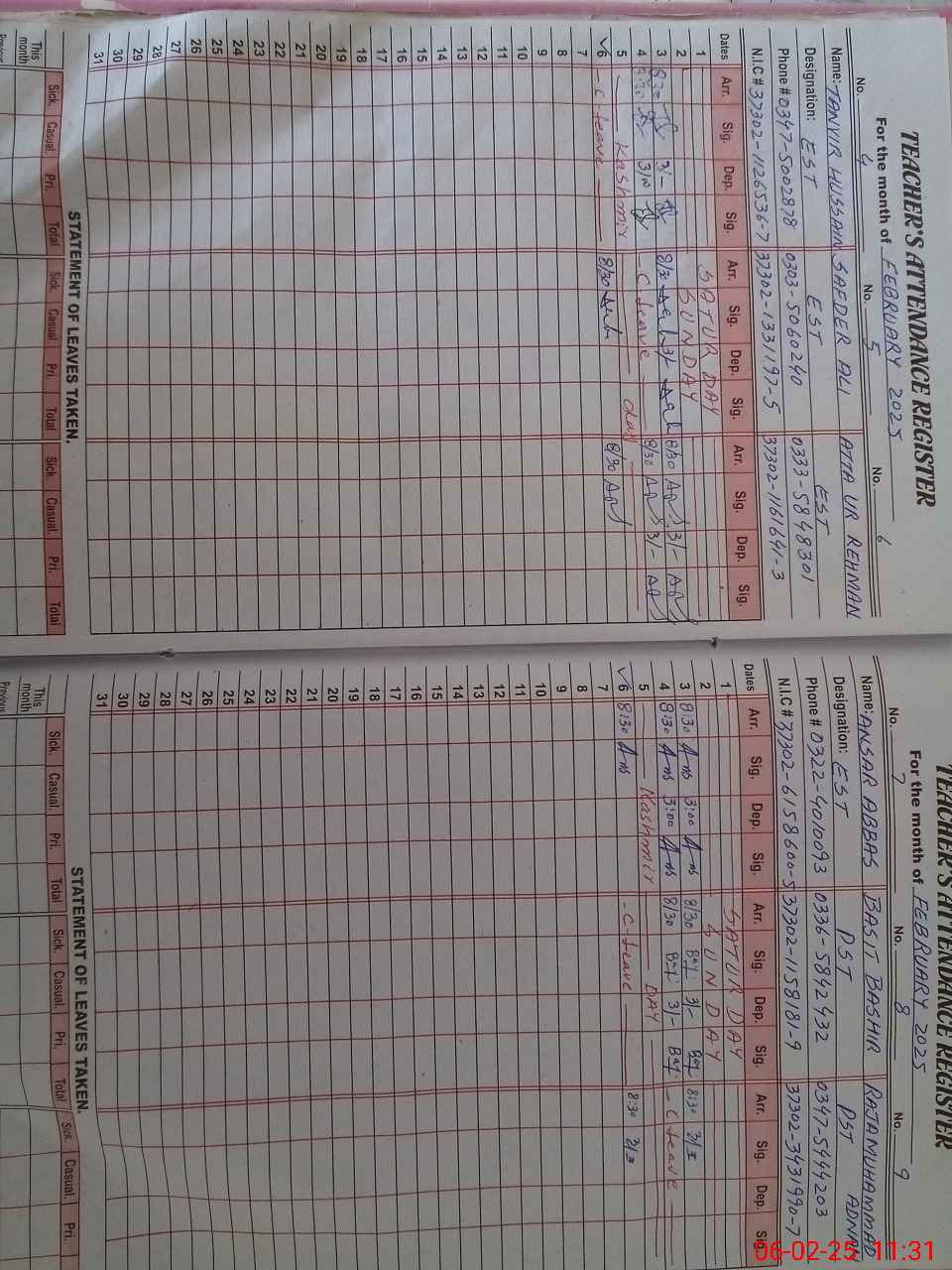 | CNIC | Full Name | Designation | R/C | Absence During Last Calender Month |