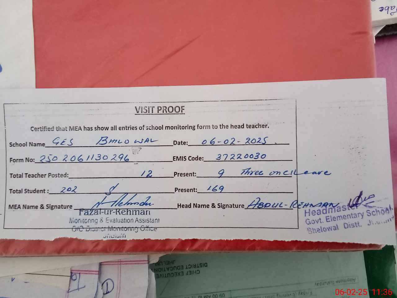 | Attendance Register | Head Teacher | MEA with School | Visit Proof |