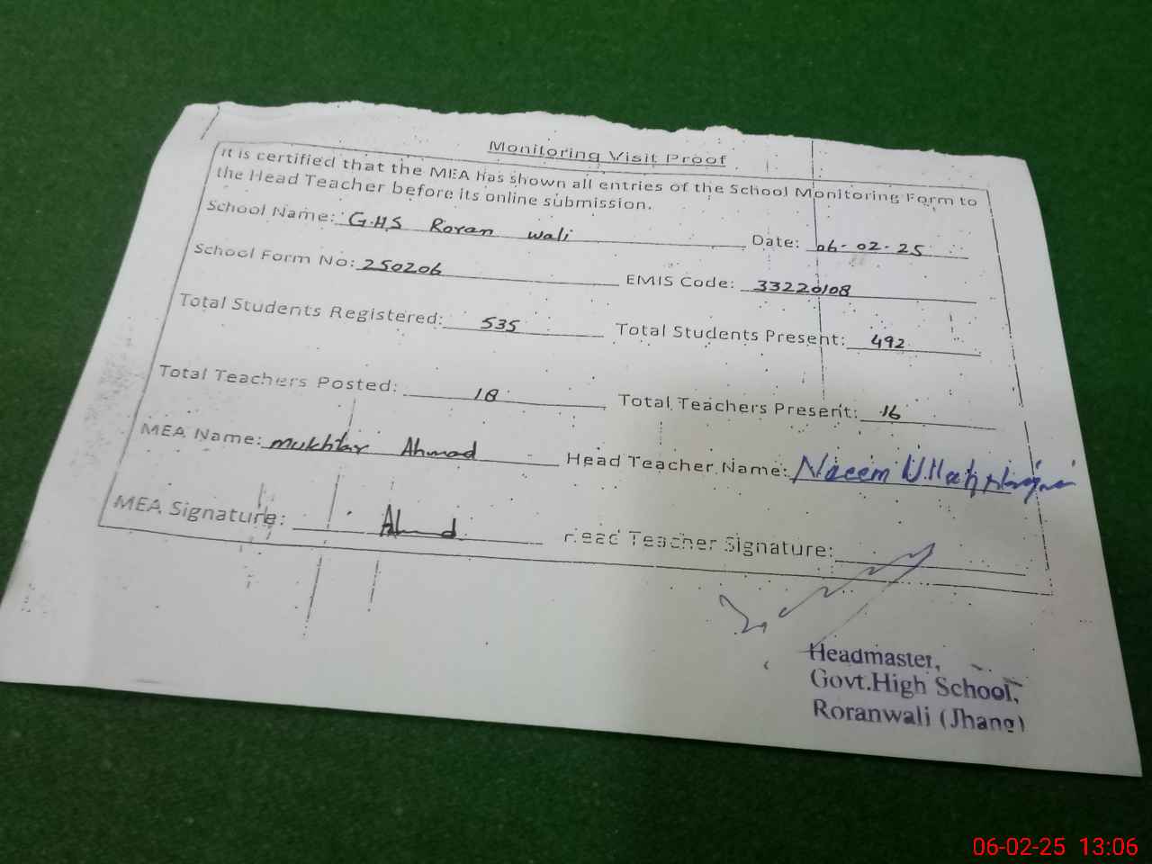 | EMIS Code: 33220108 | Name of School: GHS RORAN WALI | |||