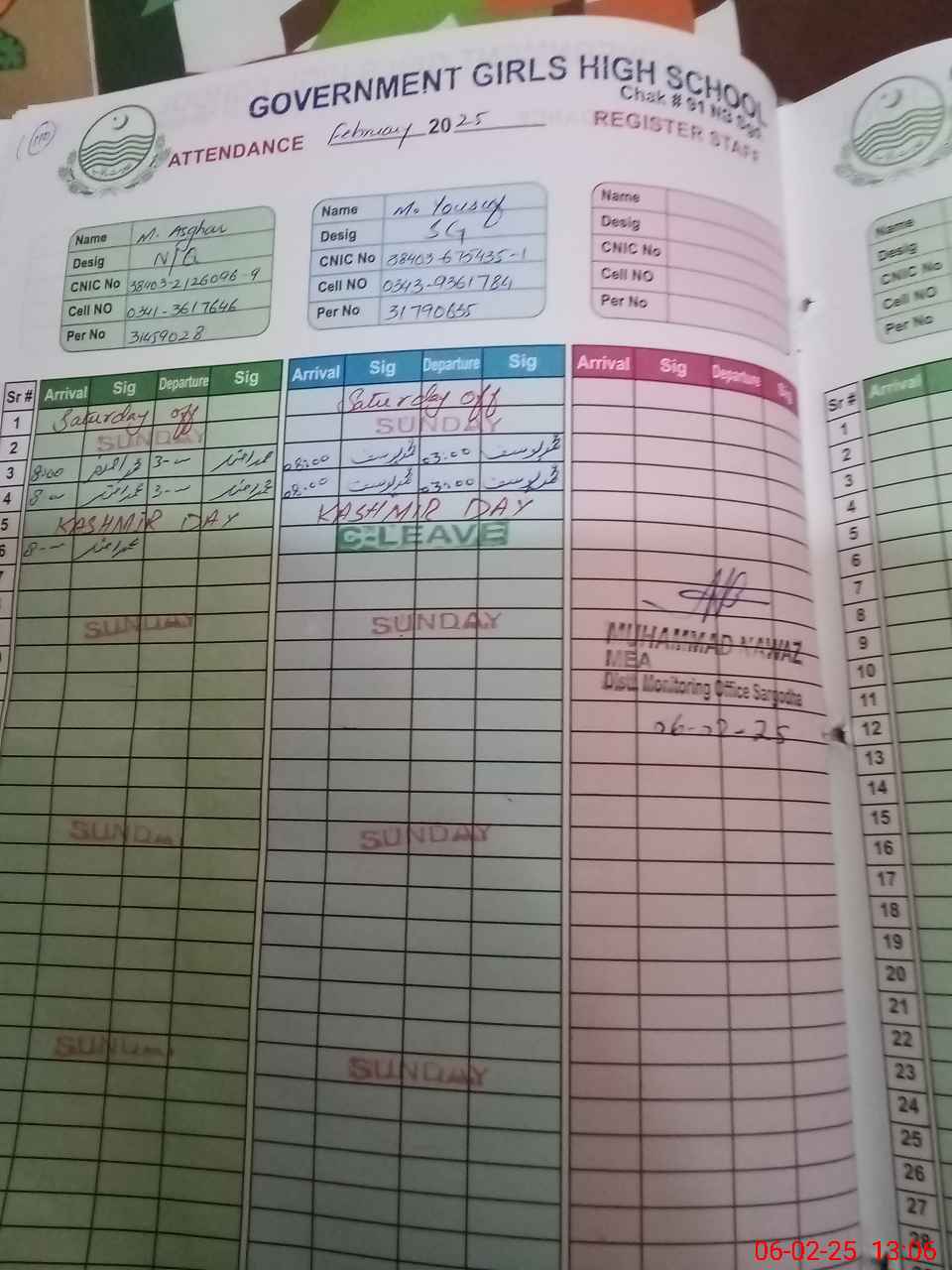 | CNIC | Full Name | Designation | R/C | Absence during last cal. month |