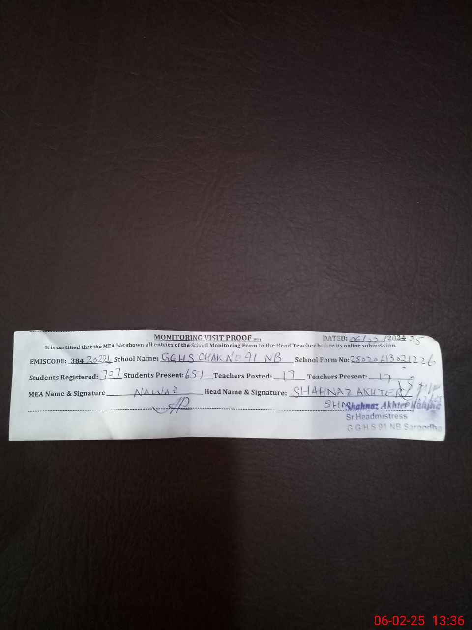 | Attendance Register | Head Teacher | MEA with School | Visit Proof |