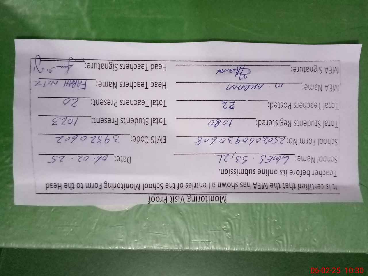 | Certified that this School was Inspected by the Undersigned MEA/DMO Today and the Information Stated Above is as Per Record. | |||||