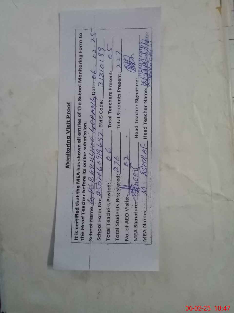 | EMIS Code: 31310199 | Name of School: GPS BAKHSHO GOPANG (After Noon) | |||