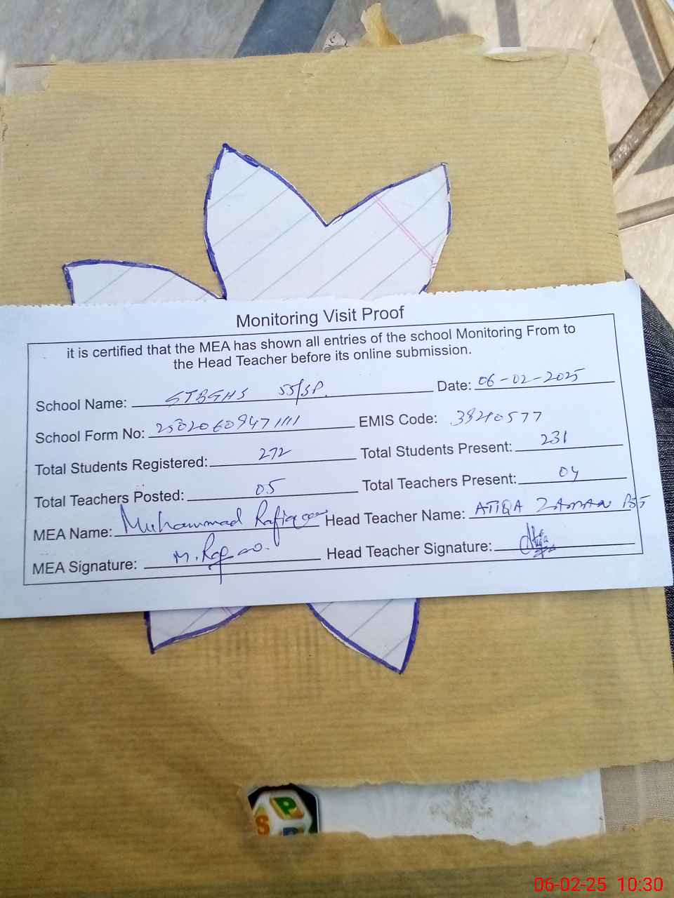 | Attendance Register | Head Teacher | MEA with School | Visit Proof |