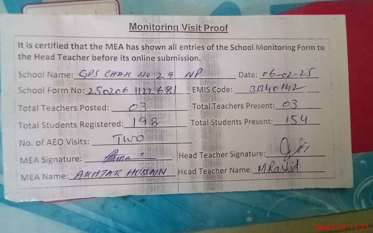 | EMIS Code: 31340142 | Name of School: GPS CHAK NO. 29/NP | |||