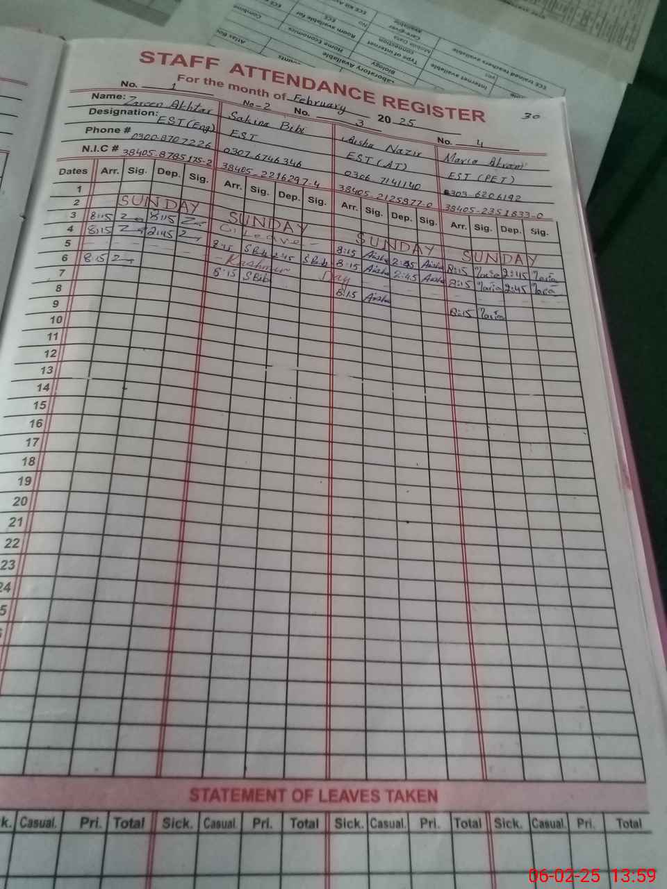 | CNIC | Full Name | Designation | R/C | Absence During Last Calender Month |