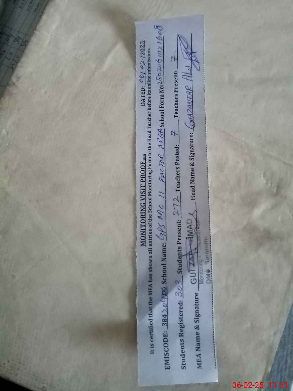 | Attendance Register | Head Teacher | MEA with School | Visit Proof |