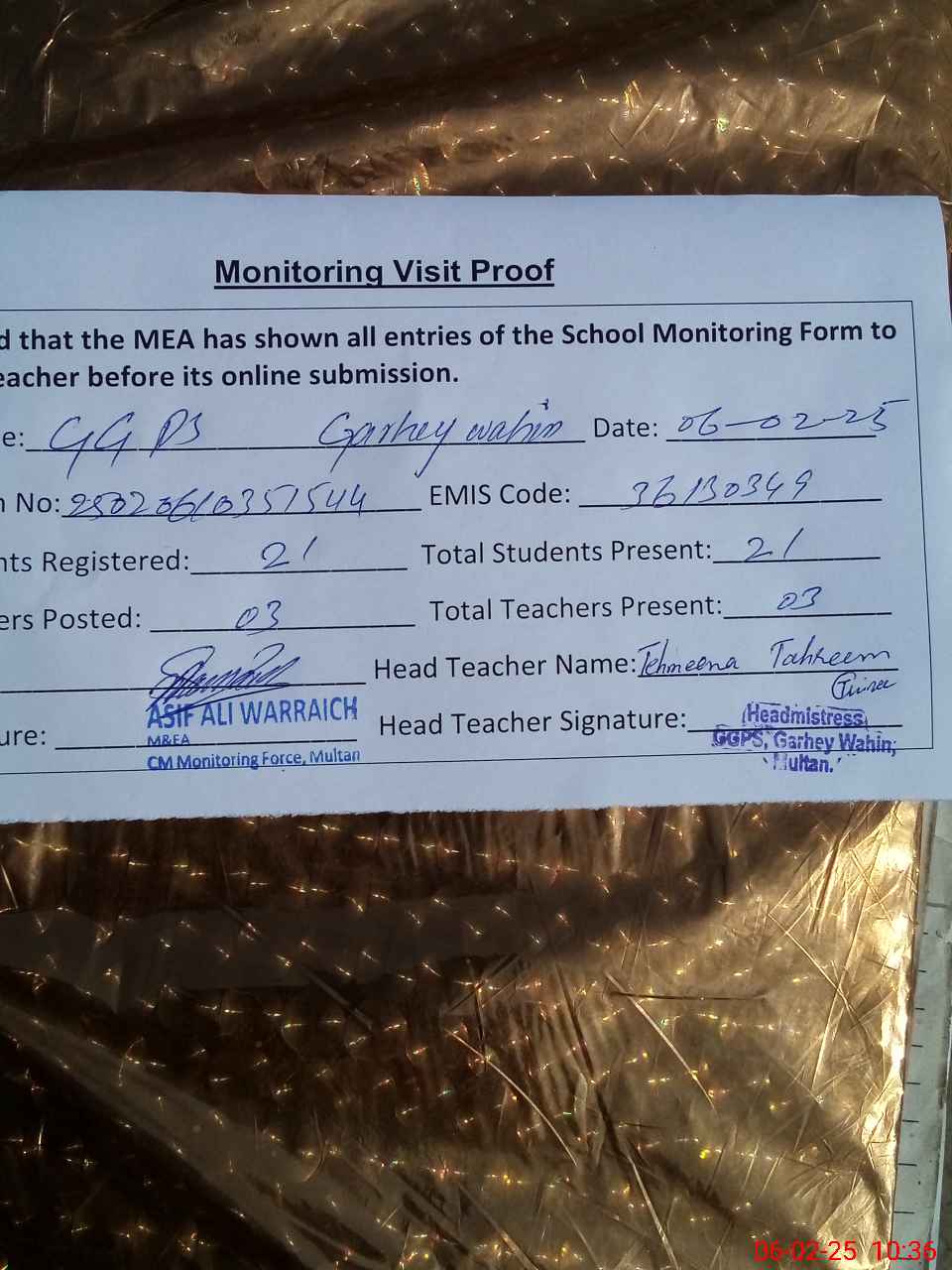 | Attendance Register | Head Teacher | MEA with School | Visit Proof |