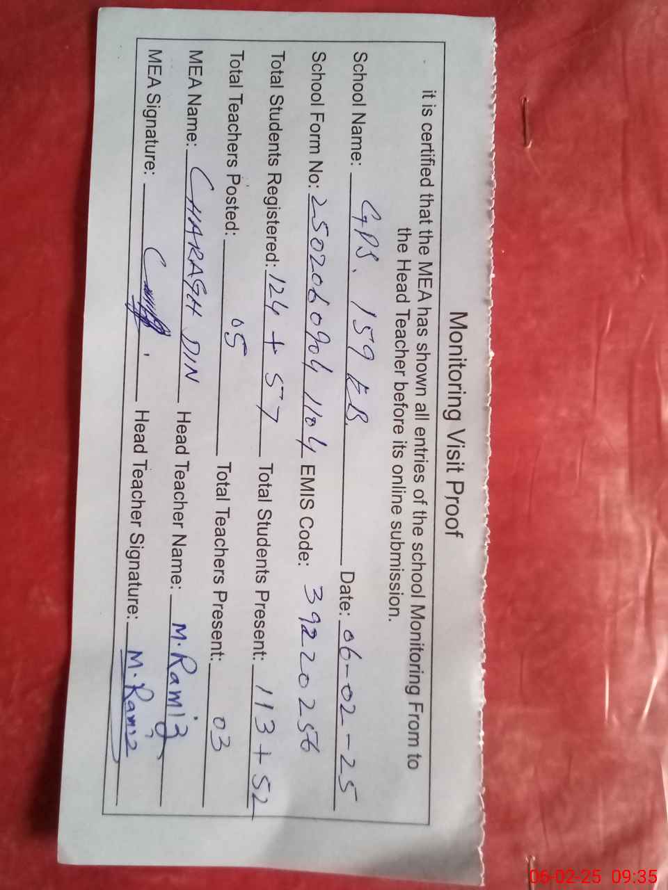 | EMIS Code: 39220256 | Name of School: GPS 159 EB P.O ARIF WALA | |||