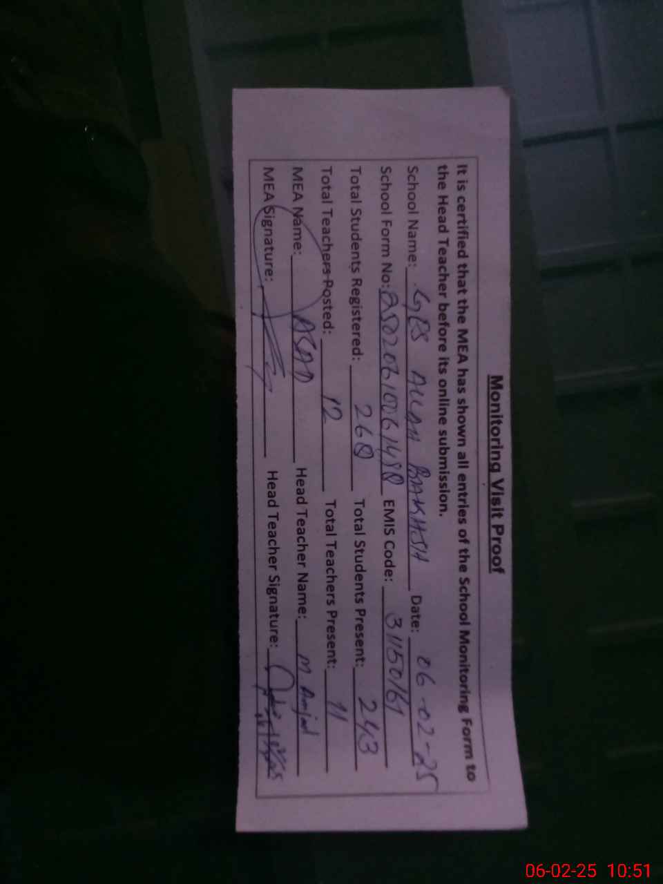 | Attendance Register | Head Teacher | MEA with School | Visit Proof |