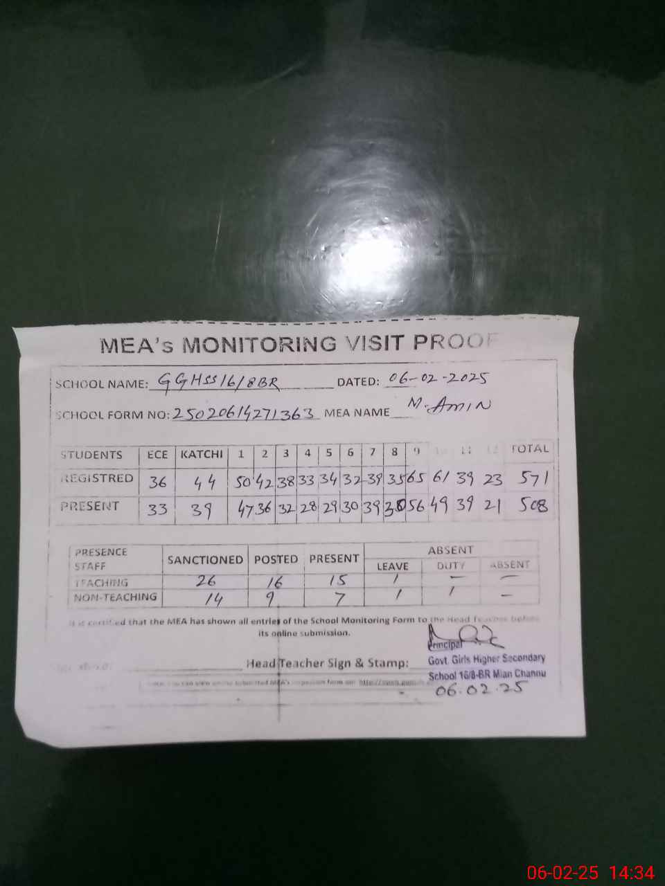 | Attendance Register | Head Teacher | MEA with School | Visit Proof |