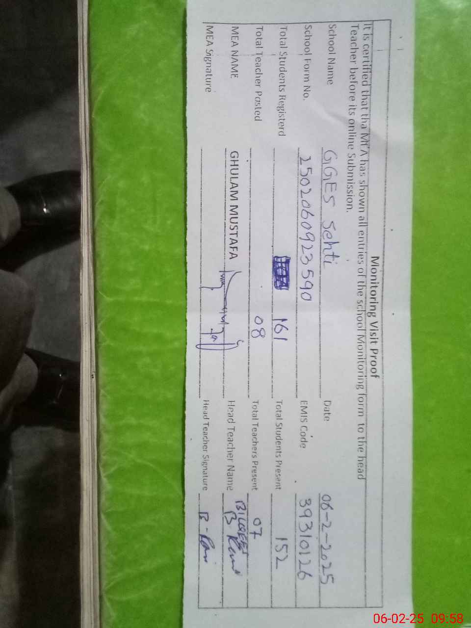 | Attendance Register | Head Teacher | MEA with School | Visit Proof |