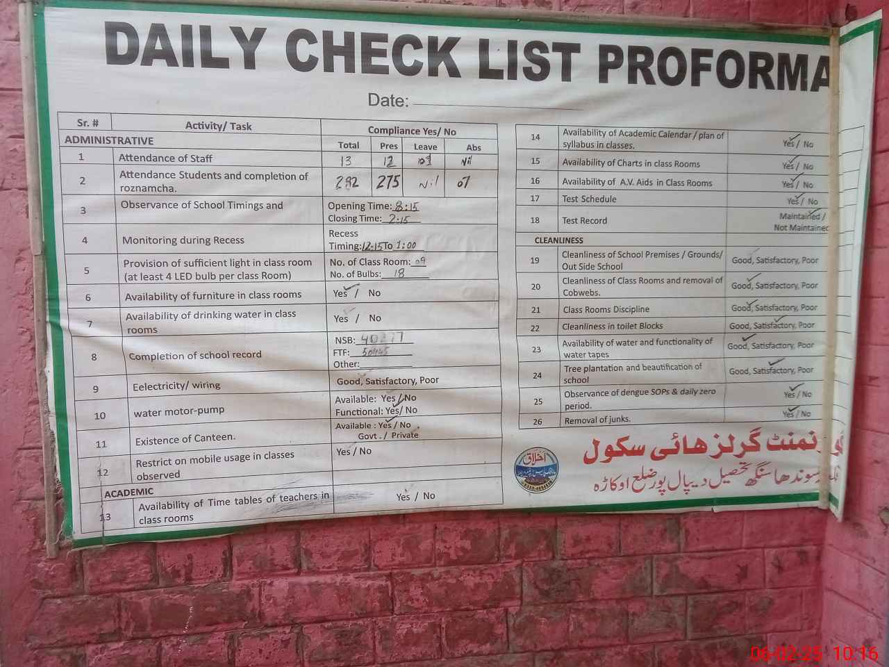 | Total no. of Classrooms: 11 No. of Classrooms Used for Teaching: 9 No. of Classrooms Storing Old Furniture, FTBs, etc: 0Comments if Any: Nominal roll for online attendance found contrary to current students records All enrolled students provided with free taxtbooks accordingly It is pertinent to mentioned here that whenever I visited the school the head teacher Aziza Bibi found absent fr |