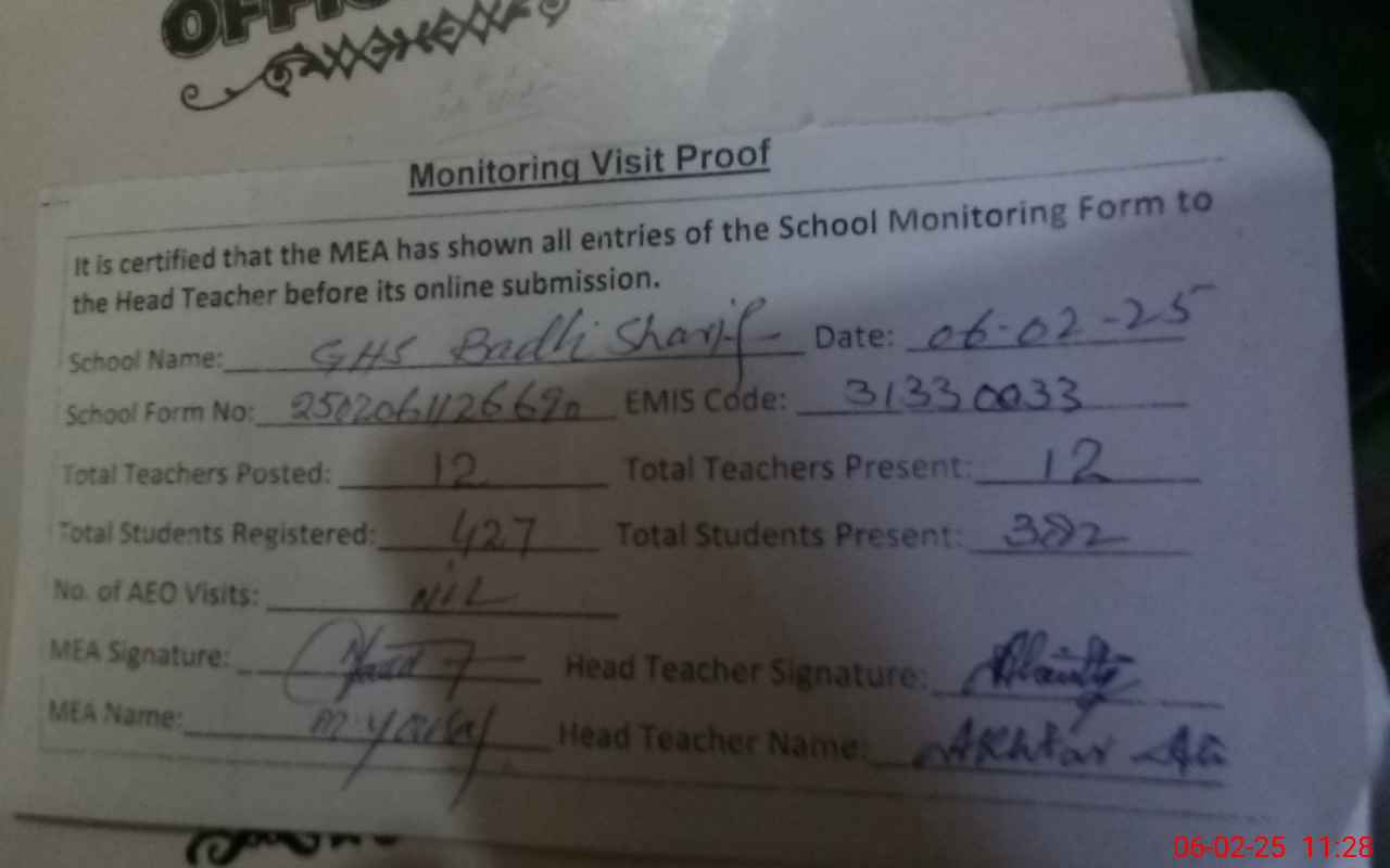 | EMIS Code: 31330033 | Name of School: GHS BADLI SHARIF | |||