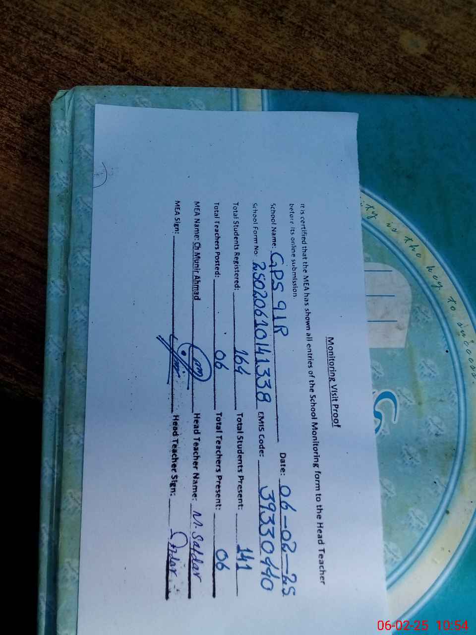 | Attendance Register | Head Teacher | MEA with School | Visit Proof |