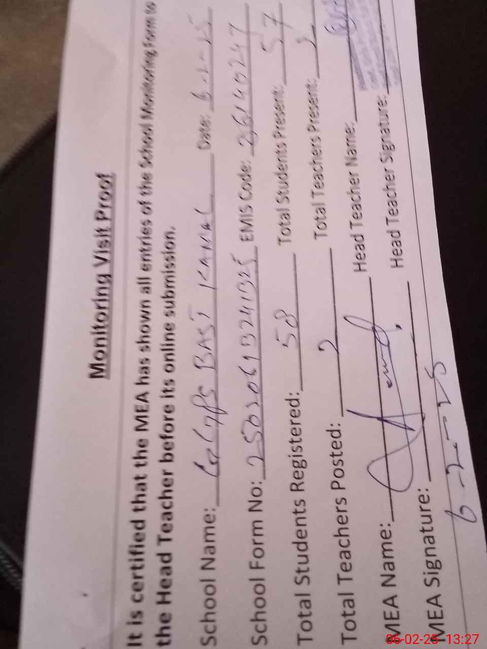 | Attendance Register | Head Teacher | MEA with School | Visit Proof |