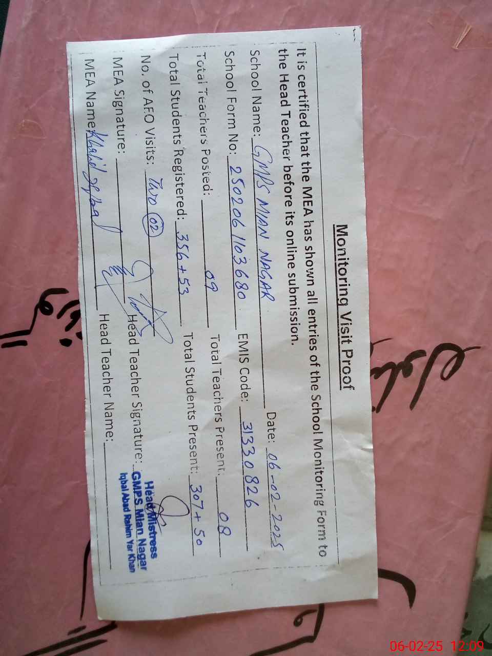 | EMIS Code: 31330826 | Name of School: GMPS MIAN NAGAR | |||
