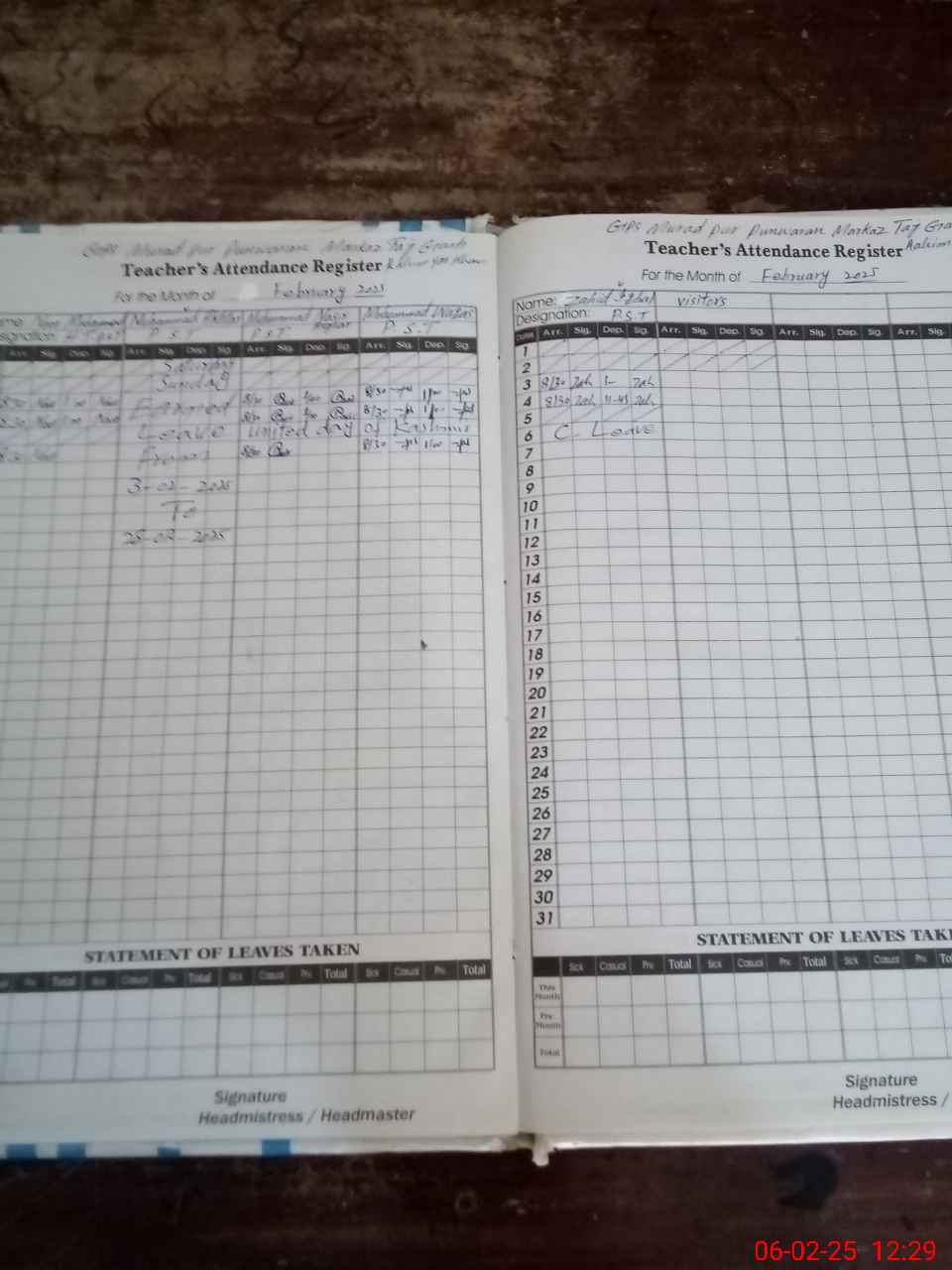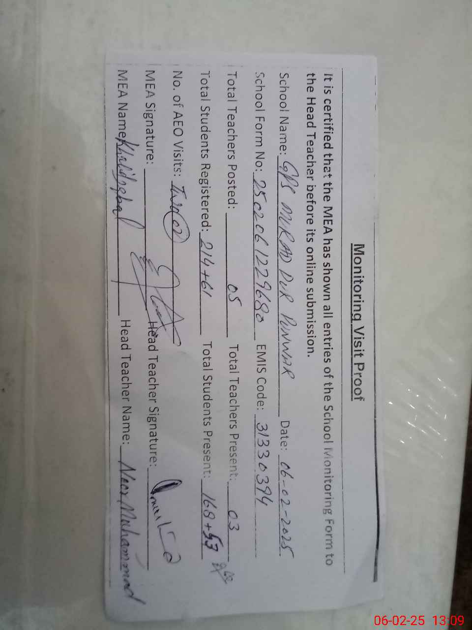 | Remarks (Use Separate Page if Required): Class verification is not updated on mea tab as per sis and teachers attendance updated on sis today and school has insaf afternoon classes with students strength 61 and two classes are sitting under shed and one class is sitting on open air | |||||