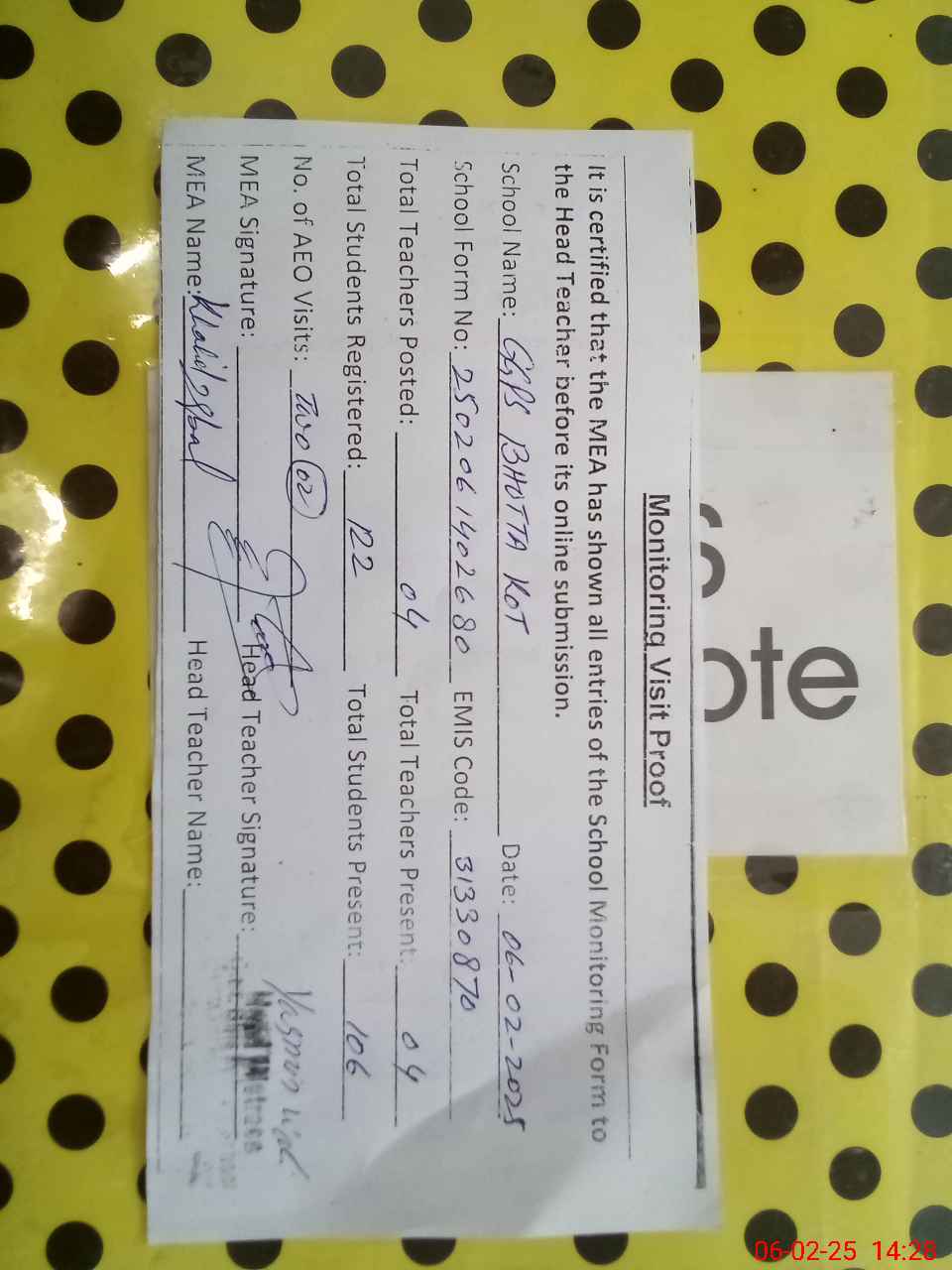 | EMIS Code: 31330870 | Name of School: GGPS BHUTTA KOT | |||