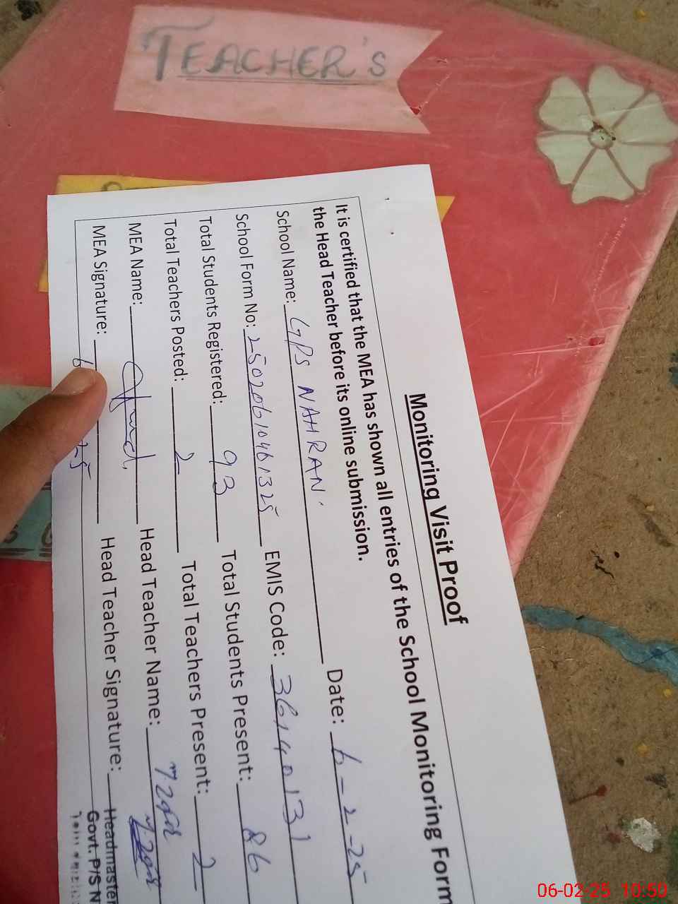 | Attendance Register | Head Teacher | MEA with School | Visit Proof |