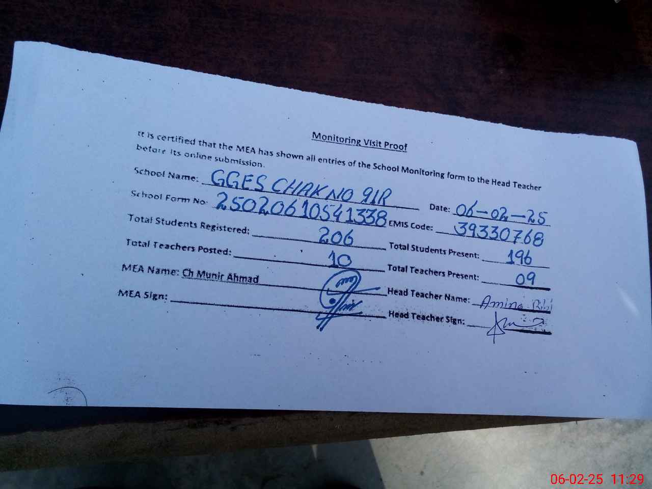 | Attendance Register | Head Teacher | MEA with School | Visit Proof |