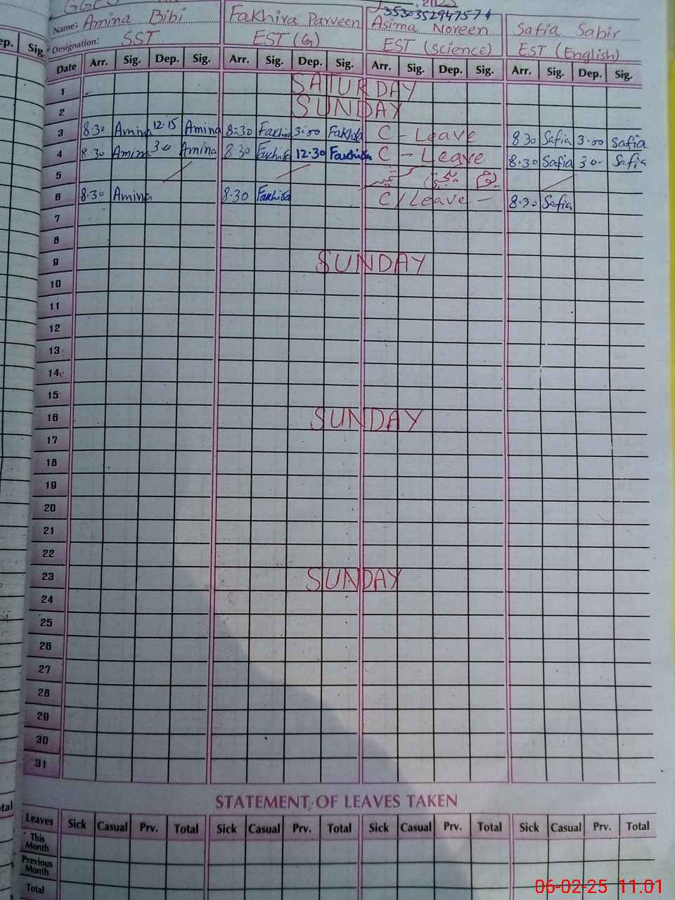 | CNIC | Full Name | Designation | R/C | Absence During Last Calender Month |