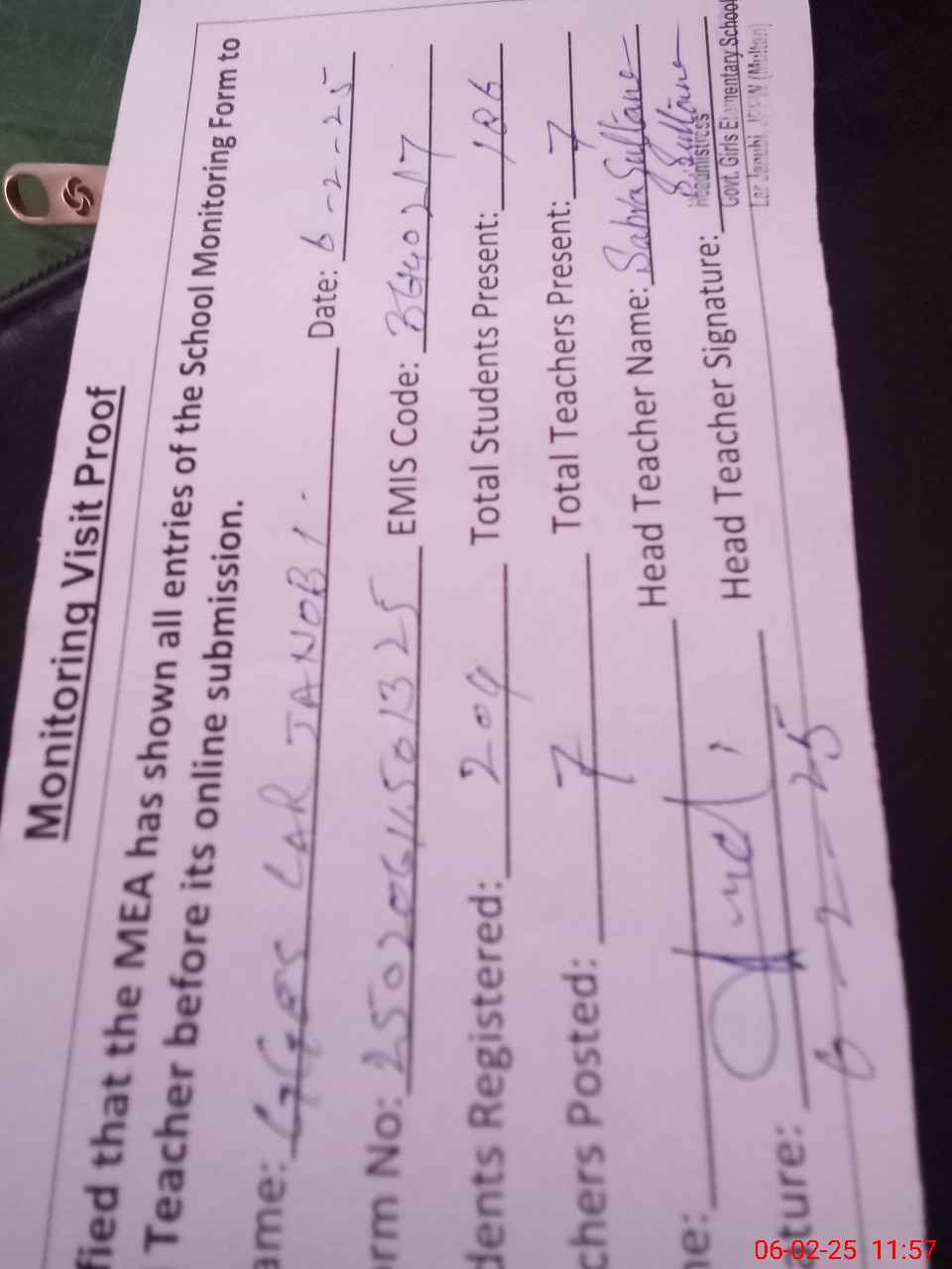 | Attendance Register | Head Teacher | MEA with School | Visit Proof |