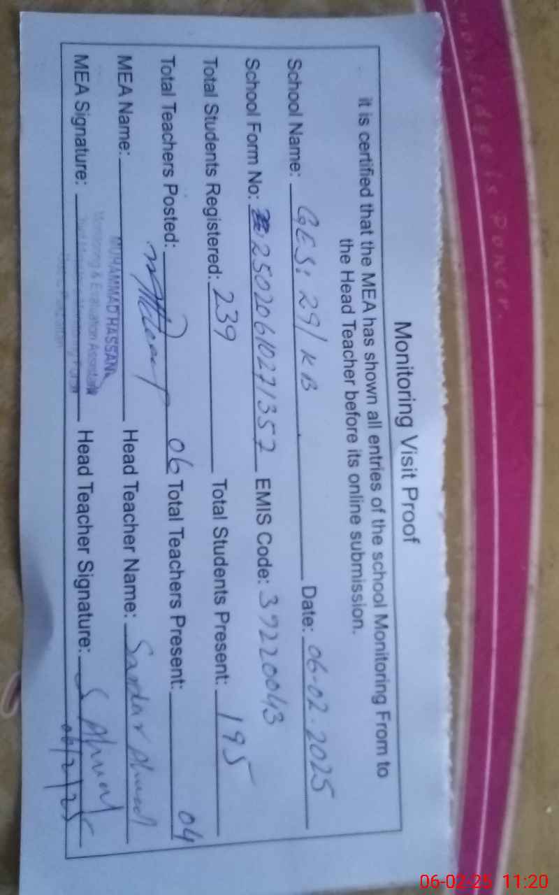 | EMIS Code: 39220043 | Name of School: GES CHAK NO. 29 KB | |||
