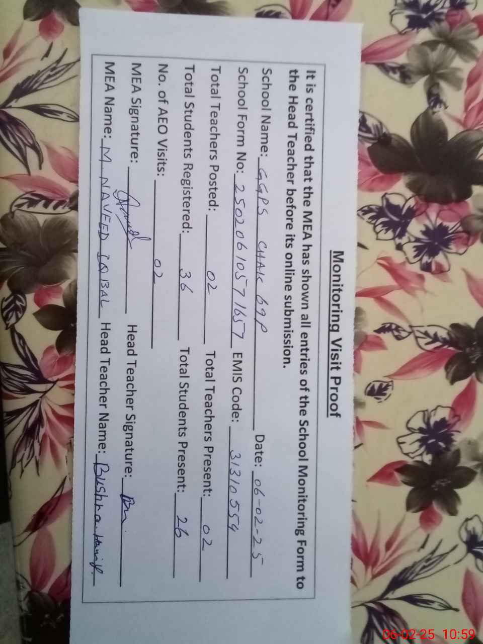| Certified that this School was Inspected by the Undersigned MEA/DMO Today and the Information Stated Above is as Per Record. | |||||