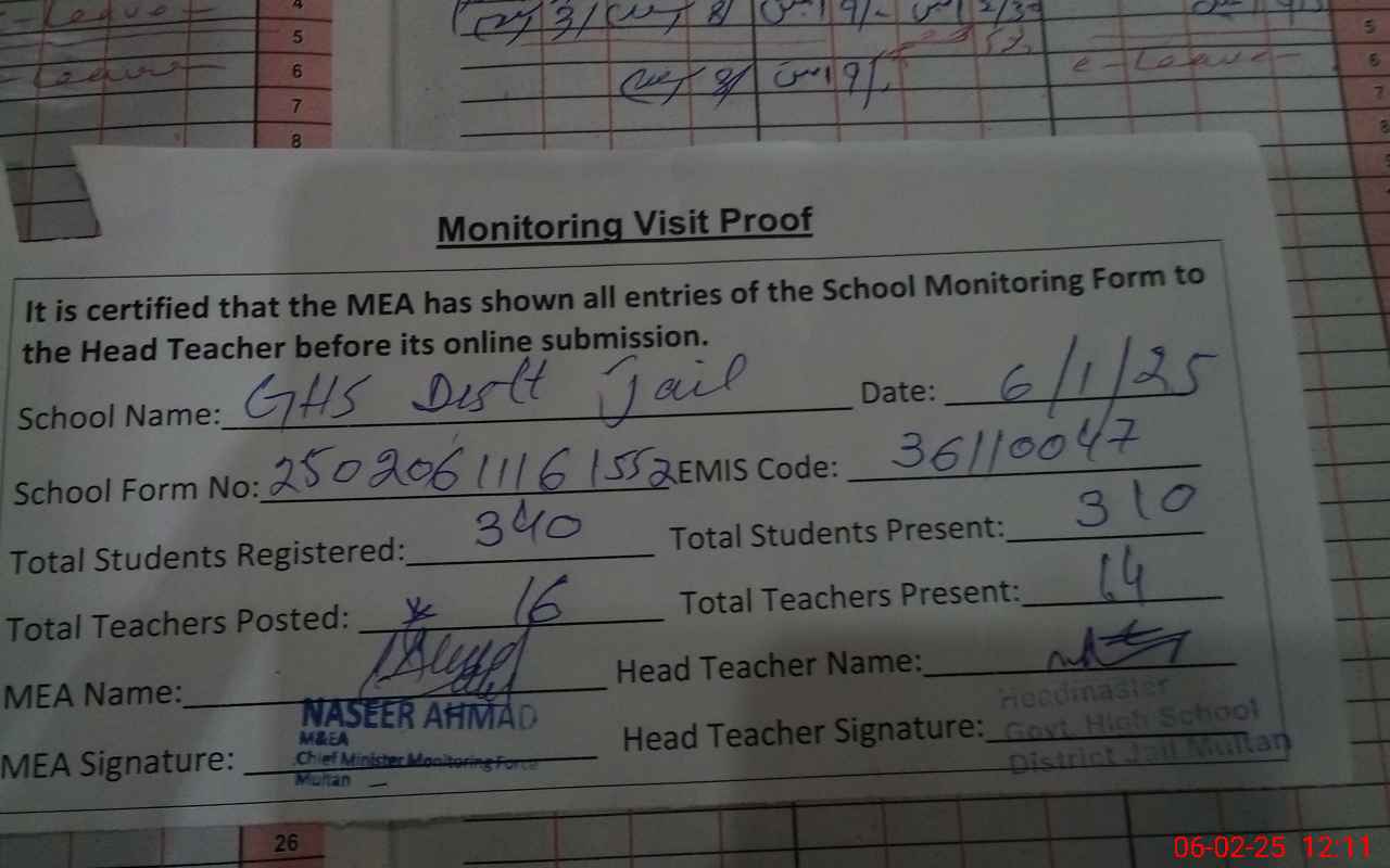 | EMIS Code: 36110047 | Name of School: GHS DISTRICT JAIL MULTAN | |||