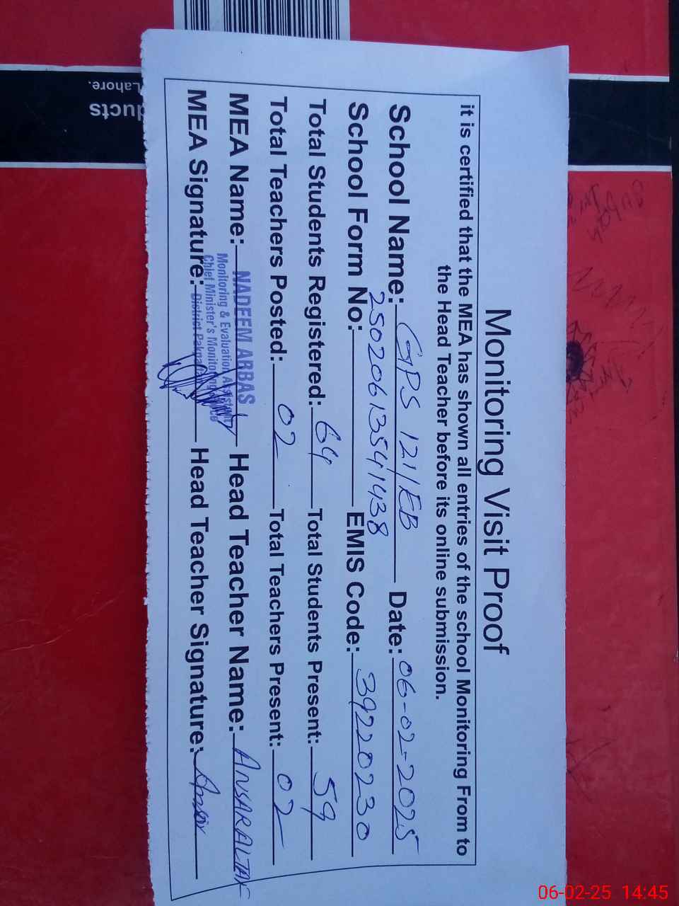 | Attendance Register | Head Teacher | MEA with School | Visit Proof |