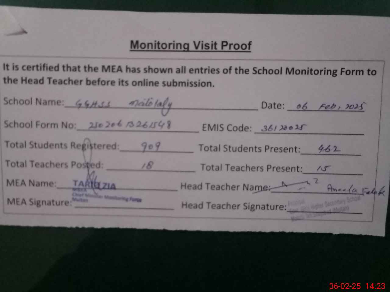 | Attendance Register | Head Teacher | MEA with School | Visit Proof |