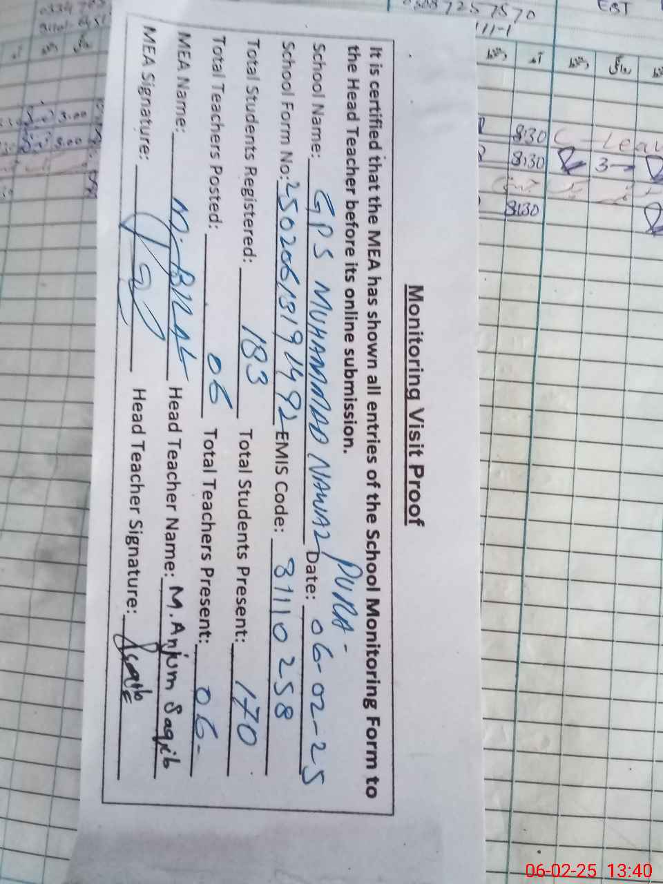 | Attendance Register | Head Teacher | MEA with School | Visit Proof |