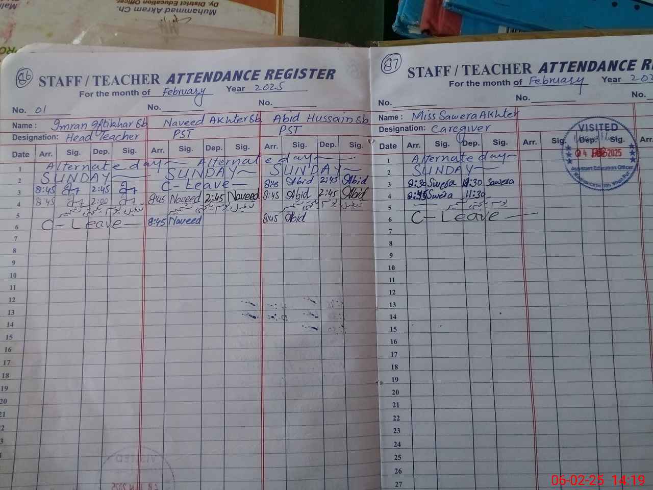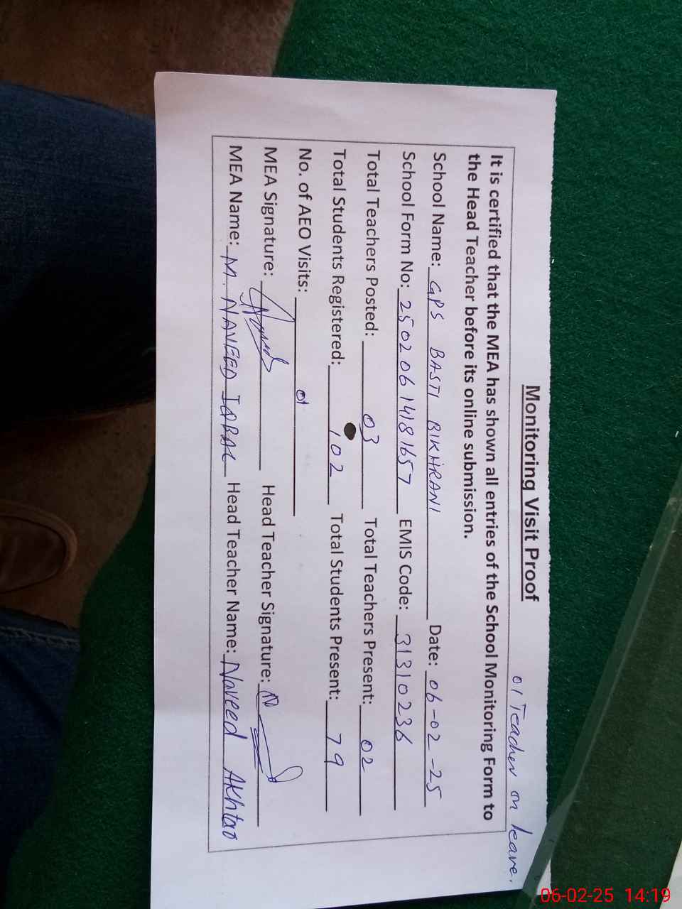 | Attendance Register | Head Teacher | MEA with School | Visit Proof |
