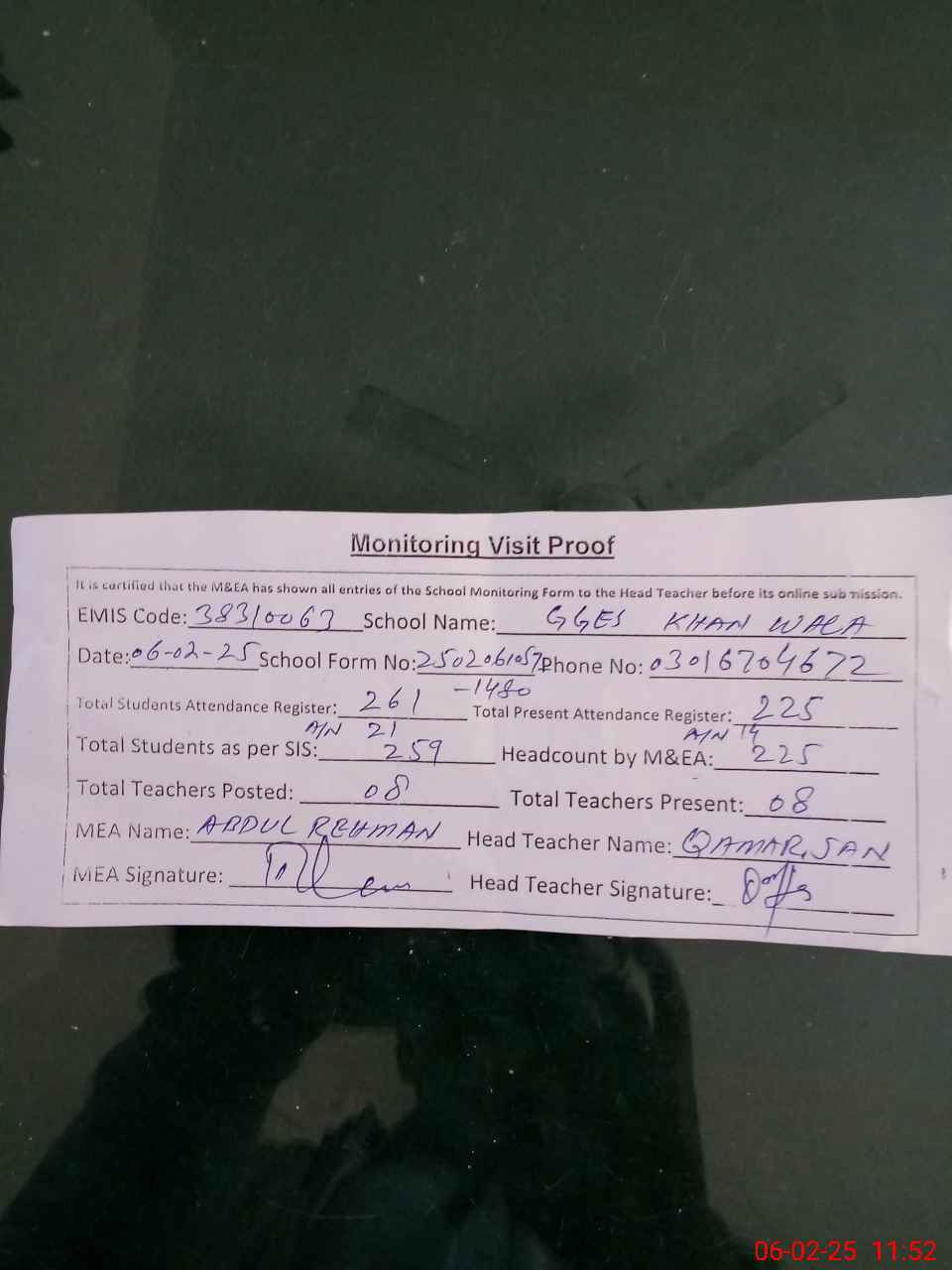 | Attendance Register | Head Teacher | MEA with School | Visit Proof |