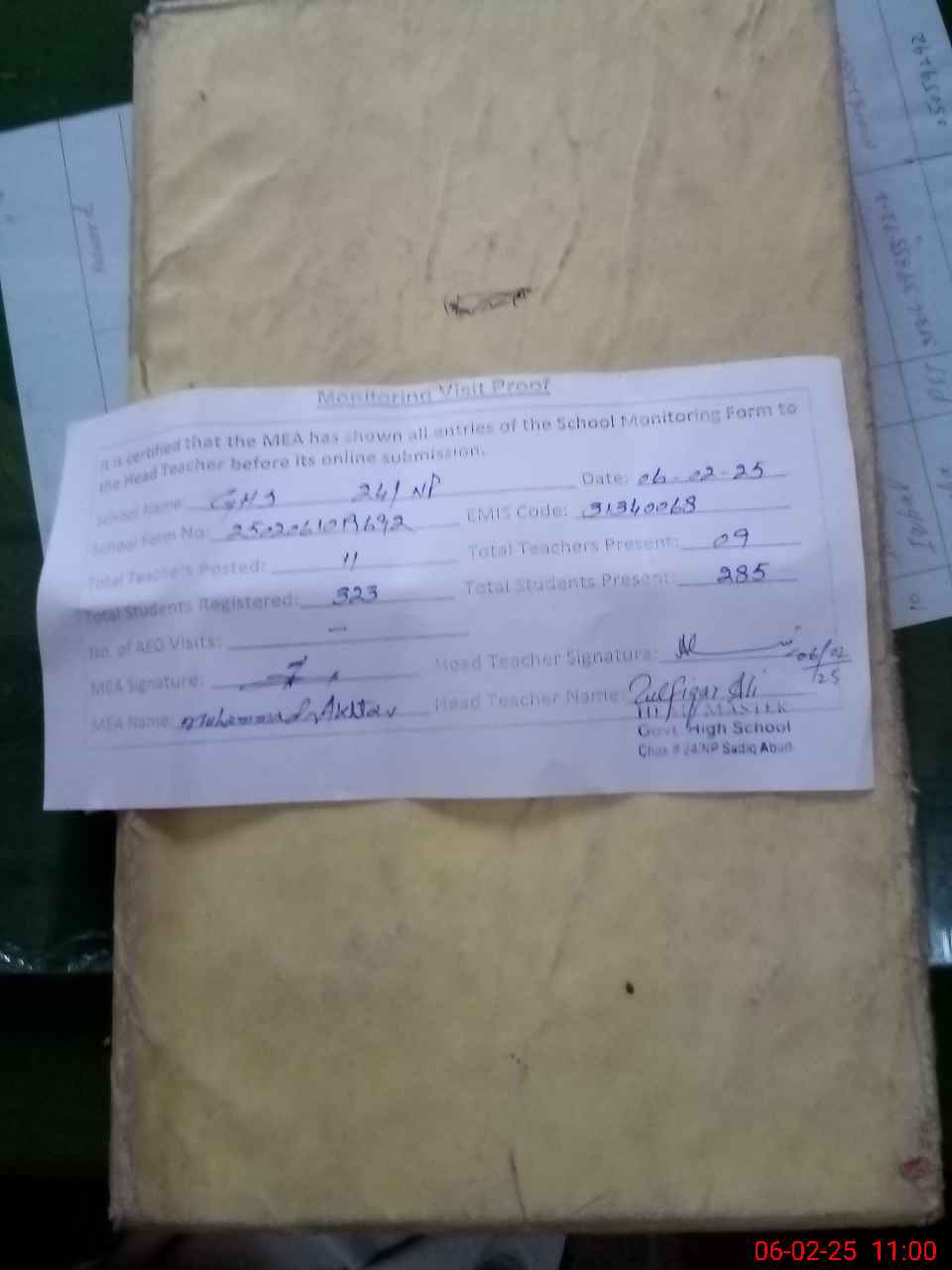 | Attendance Register | Head Teacher | MEA with School | Visit Proof |