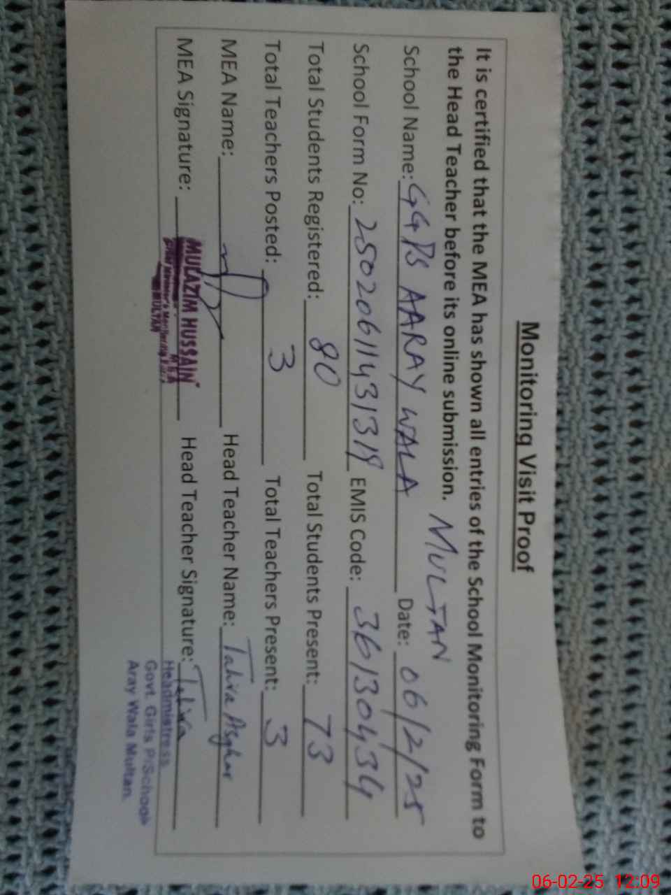 | EMIS Code: 36130434 | Name of School: GGPS AARAY WALA MUZA JHOK LASHAKAR PUR | |||
