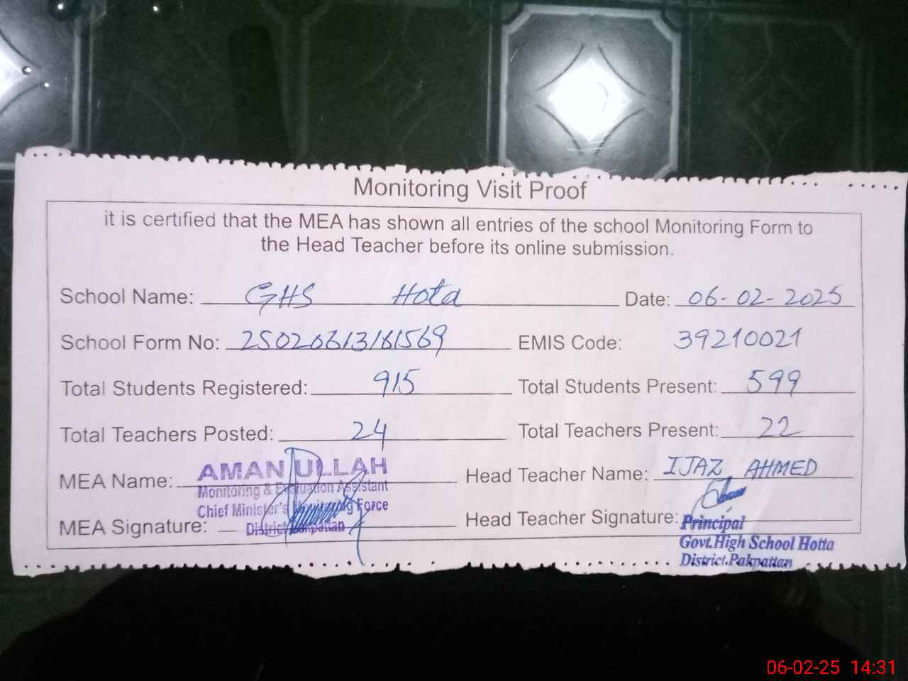 | EMIS Code: 39210021 | Name of School: GHS HOTTA | |||